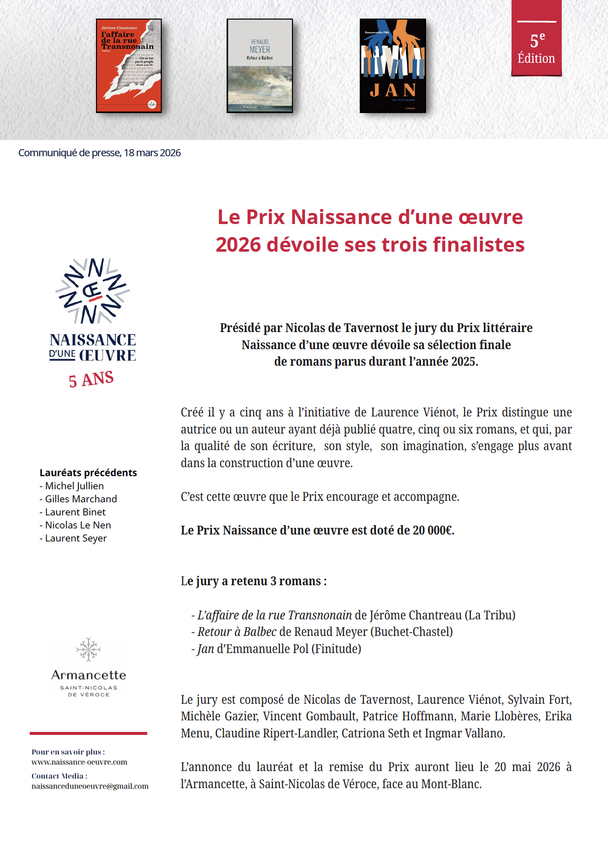 Après une première sélection de sept romans en janvier, les membres du jury ont procédé à une deuxième sélection le 31 mars. L’annonce du lauréat et la remise du Prix auront lieu le 21 mai 2025 à l’Armancette, à Saint-Nicolas de Véroce, face au Mont-Blanc. Trois romans sont en lice.