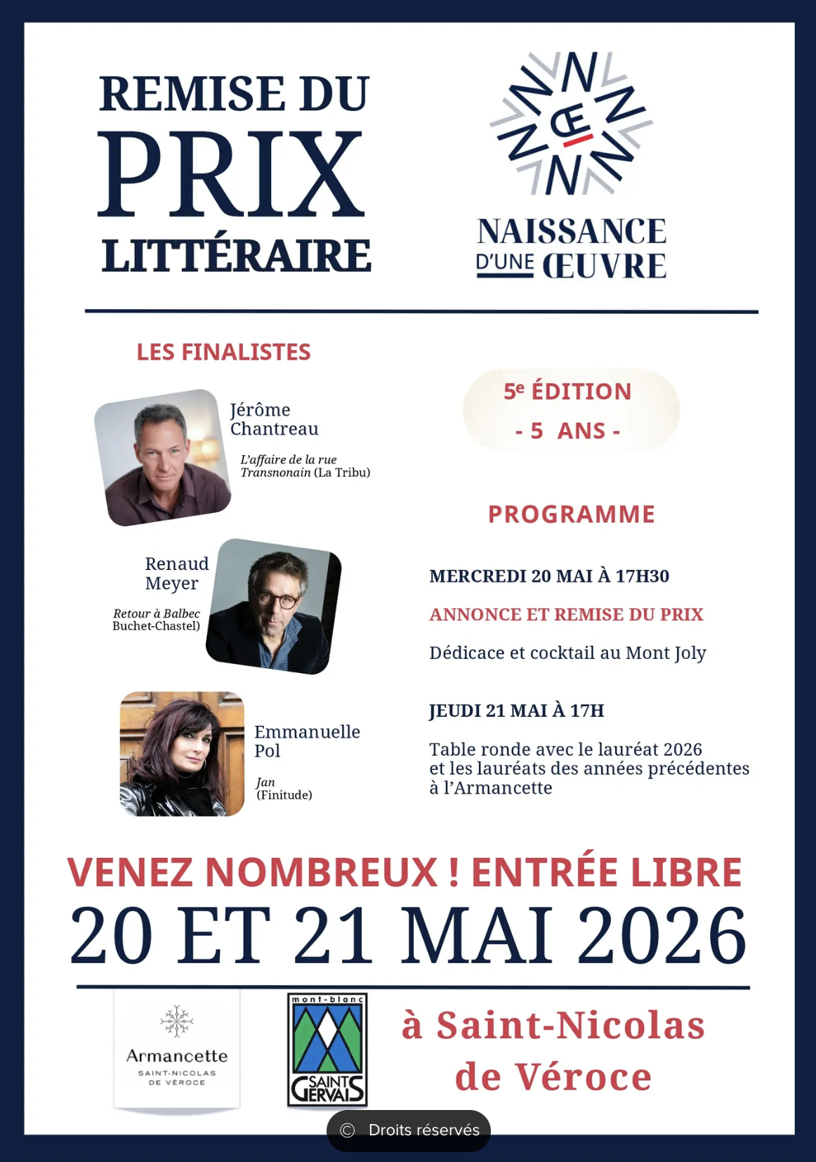 Venez nombreux à la 5e édition de la remise du prix littéraire. Au programme : annonce et remise du prix, dédicace et cocktail, table ronde avec le lauréat 2026 et les lauréats des années précédentes.
