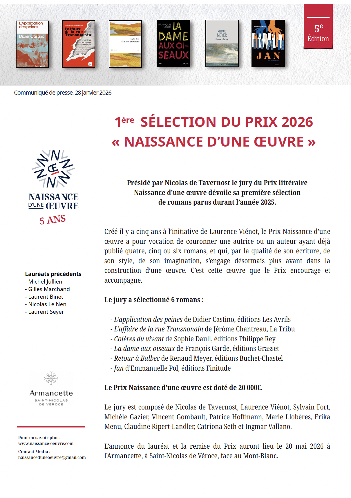 Après une première sélection de sept romans en janvier, les membres du jury ont procédé à une deuxième sélection le 31 mars. L’annonce du lauréat et la remise du Prix auront lieu le 21 mai 2025 à l’Armancette, à Saint-Nicolas de Véroce, face au Mont-Blanc. Trois romans sont en lice.